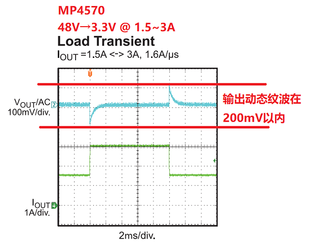 (3)MP2565是非同步降压芯片,用在跳变负载模式下,动态纹波较大,效果并不理想,建议尝试增加多颗22uF输出电容的陶瓷电容,改善动态纹波(最好是选择使用同步CCM模式的方案,例如: