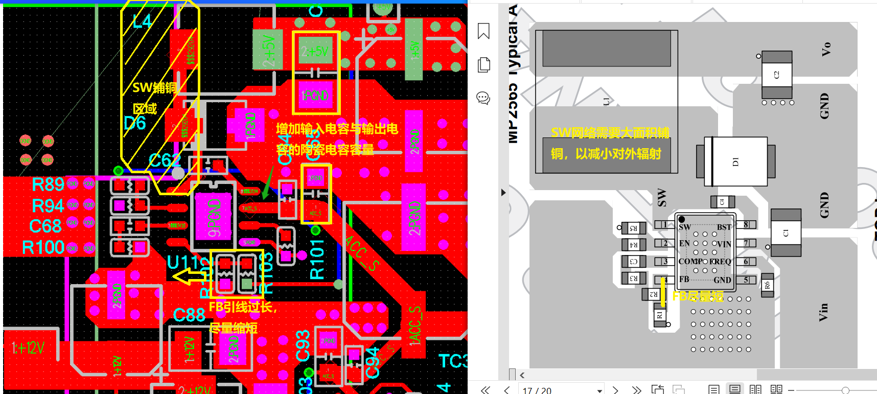 (1)SW是高频dV/dt跳变信号,对外有较强电场辐射,需要进行铺铜以减小辐射量;