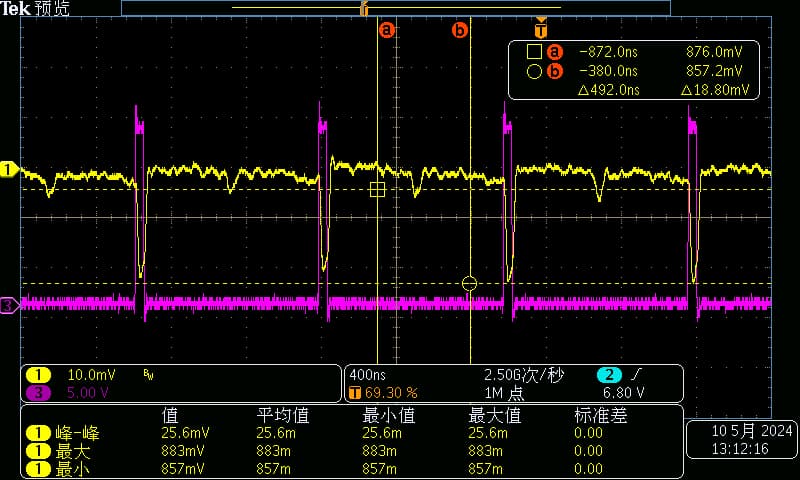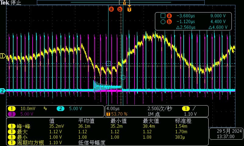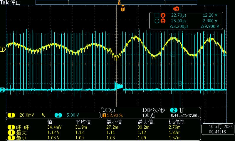 2、mp2979A+mp86941C,APS功能由1phase切换2phase工作的过程中,VOUT会出现波动,下图为VOUT与Vphase的波形