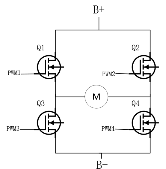 手持式吸尘器中H桥驱动直流有刷电机的简单电路结构就是下图,B+ 和 B-是接电池包的正极和负极。Q1和Q4导通,Q2和Q3关闭电机正转。Q1和Q4关闭,Q2和Q3导通则电机反转。通过调整PWM来调节电机的转速。