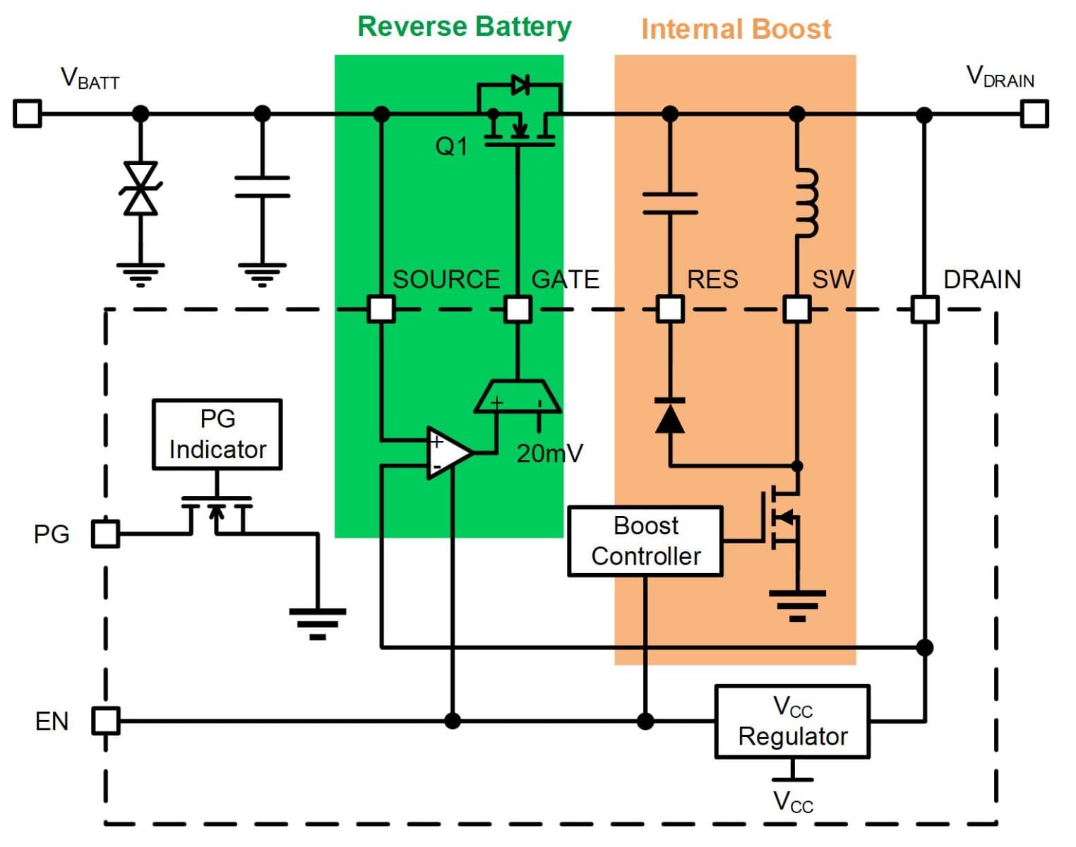MPQ5850-AEC1是一款智能理想二极管控制器,可驱动外部 N-FET ,取代肖特基二极管或 P-FET 实现反向输入保护。该器件集成了内部升压电路,即使在低输入 VBATT条件下,也能提供升压电压导通外部 N-FET。图 9 显示了该器件的功能框图。