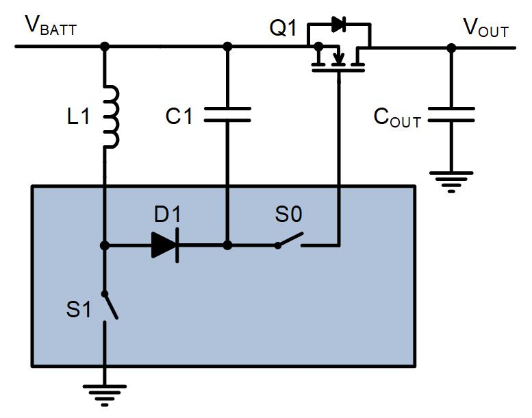 图 7 显示了升压变换器解决方案的工作原理。当 S1 导通时,电感由 VBATT充电,电感上的电流增大。一旦电感电流 (IL) 达到固定峰值电流阈值,S1 就会断开。 IL 继续流过二极管 (D1) 并为电容 (C1) 充电。当 C1 上的电压超过 VBATT时,N-FET 栅极被拉高。