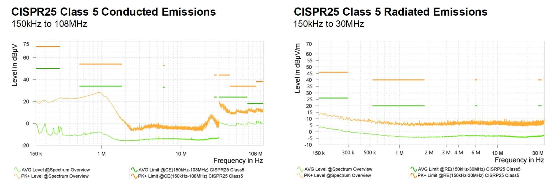 图12: MPQ5850-AEC1的 CISPR 25 Class 5 CE 和RE EMI 性能