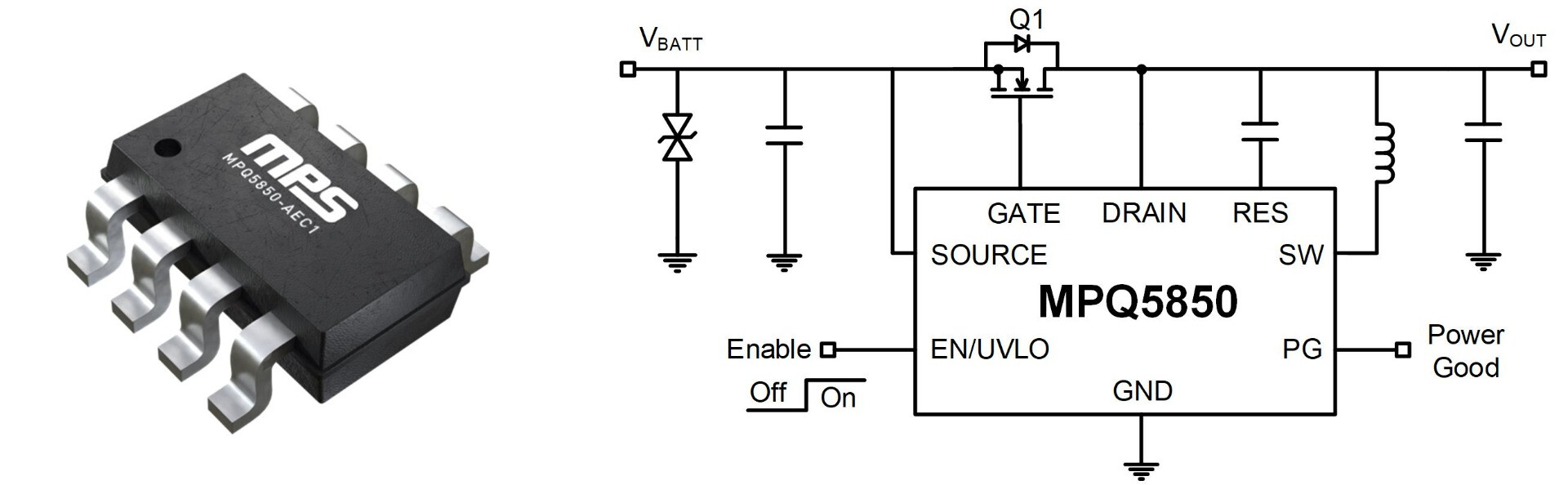 为了满足前端对大电流、快速响应和小尺寸的需求,MPS 开发了可用于汽车前端保护的 MPQ5850-AEC1(见图 8)。