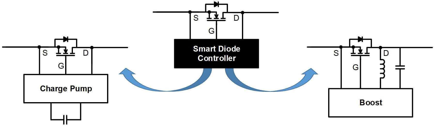 使用升压变换器驱动外部N-FET时,升压变换器的效率较高,可提供较大的驱动电流容量(超过100mA)和较快的输入干扰响应。因此对于大功率应用,建议采用集成了升压变换器的智能二极管控制器解决方案,这种方案同时还能实现良好的 VIN 整流效果。