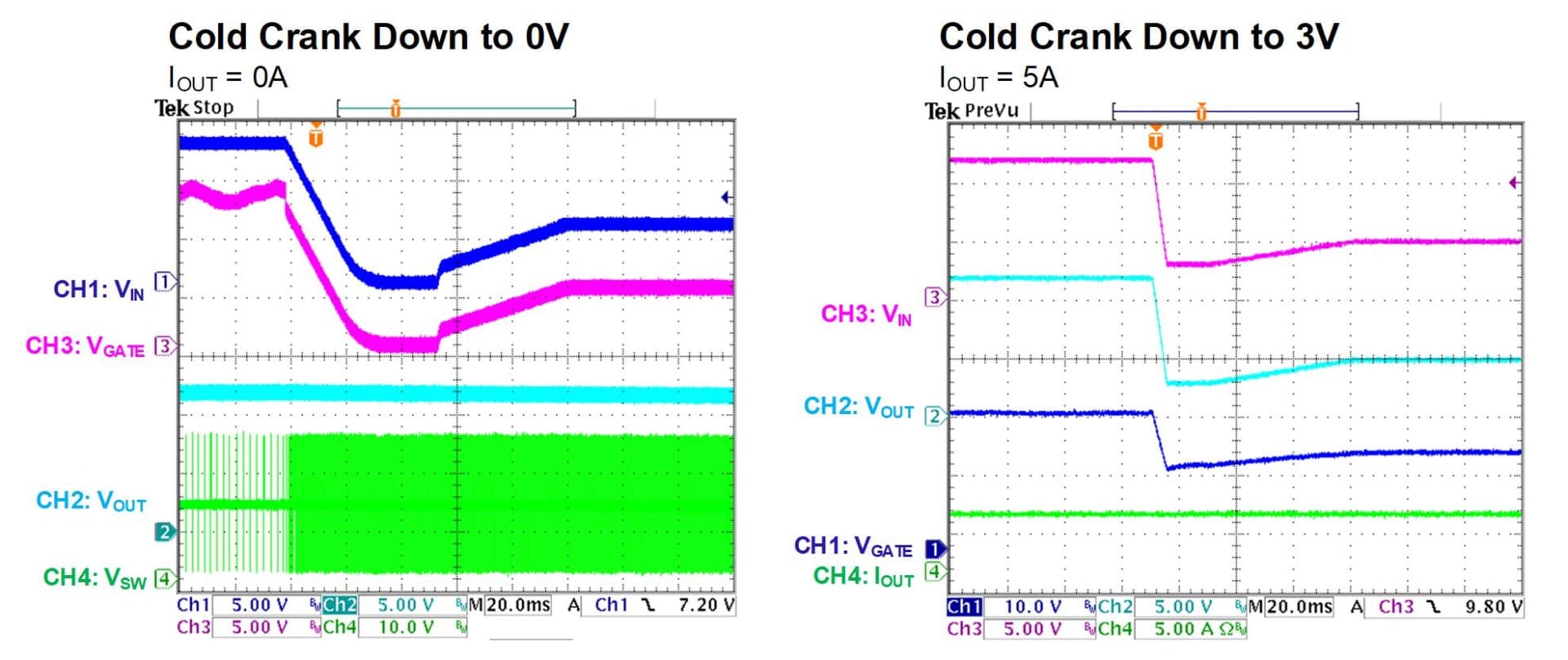 如果 VDRAIN 降至 UVLO 阈值以下,MPQ5850-AEC1会将 GATE 引脚下拉至 SOURCE 引脚(也是 N-FET 的源极),直到储能电容上的电压放电至UVLO 阈值以下。这样,该器件就能够在临时低压瞬变(例如冷启动条件)期间最小化正向压降。图 11 显示了冷启动的测试波形。