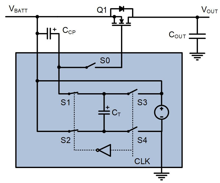这样,通过S1和S2(以及S3和S4)的频繁切换, CT 上的电荷可以不断传输到 CCP。此外, CCP的负极连接到电池电压 (VBATT),因此N-FET可以被超过 VBATT的电压驱动。