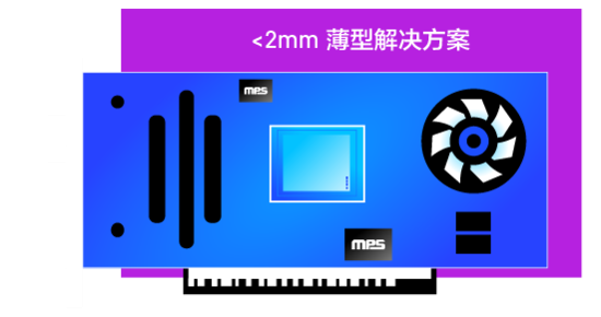 MPS提供的全集成薄型电源解决方案是加速卡的完美电源方案选择。其内部集成了电感,厚度仅为2.0mm或更薄 。整个电源解决方案都可放置在加速卡背面或散热器下方,可轻松节省电路板上部空间,并能提升加速卡工作潜能。
