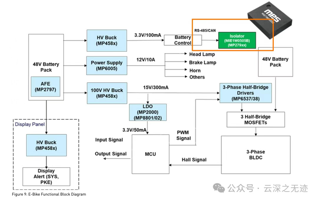 SPI 是高速全双工通信(MOSI、MISO、SCLK、CS);通过 数字隔离器 + MIE1W0505BGLVH 实现原/副边隔离,其中MIE1W0505BGLVH 为副边隔离器芯片供电。