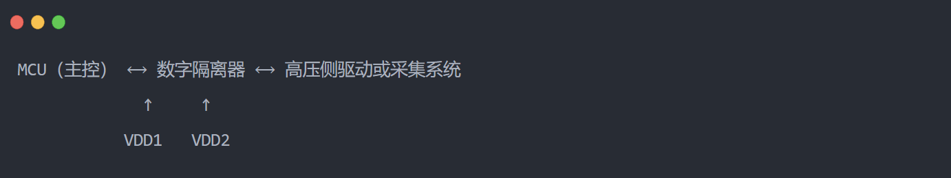 它通过电磁、电容或光耦方式隔离两边的信号,但两侧电源必须物理隔离 ,这就需要一个隔离电源模块 给“高压侧”提供独立电源(即 VDD2)。