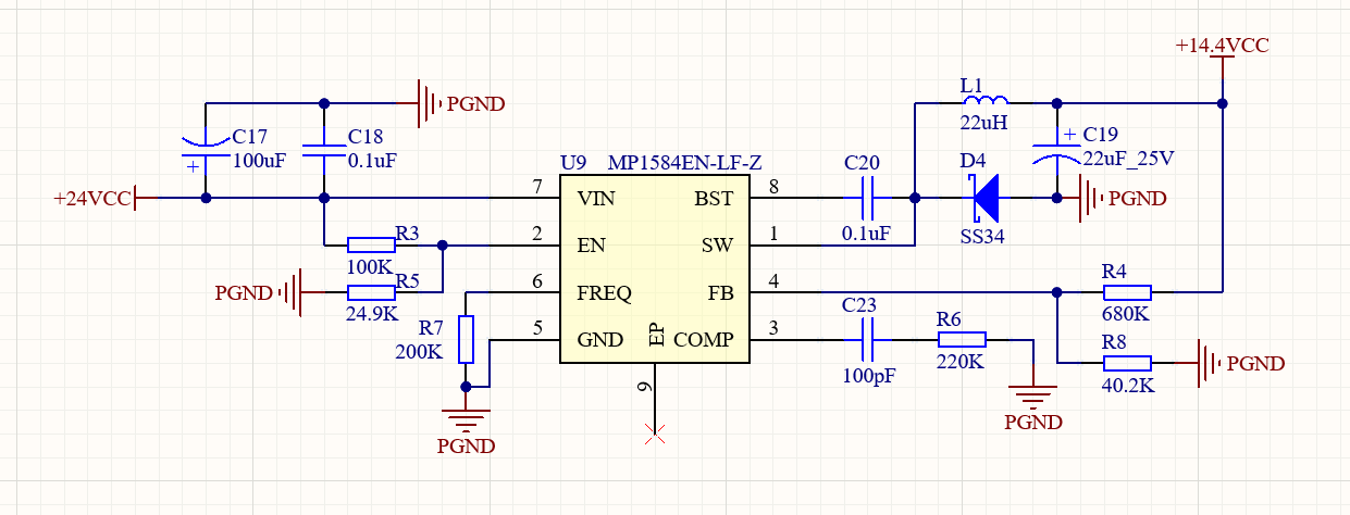 在使用MP1584EN对24V降压至14.4V时发现无法正确获得14.4V电压。 1.使用万用表测Vout:0.3V 2.使用万用表测EN:4.7V 3.使用万用表测BST:2.3V 4.使用示波器测SW:未观察到理想PWM波形 请问我该如何解决?