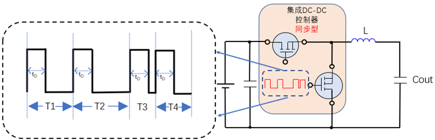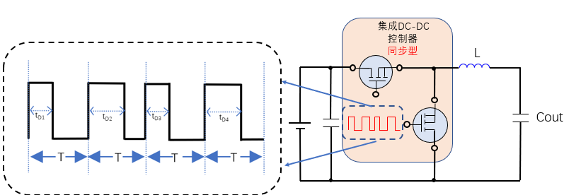 如下图是PWM控制模式的DC-DC,PWM(Pulse Width Modulation),脉冲宽度调制,顾名思义,放大图可以看出,其周期T是不变的,而脉冲宽度tD1、tD2、tD3、tD4、是不同的。