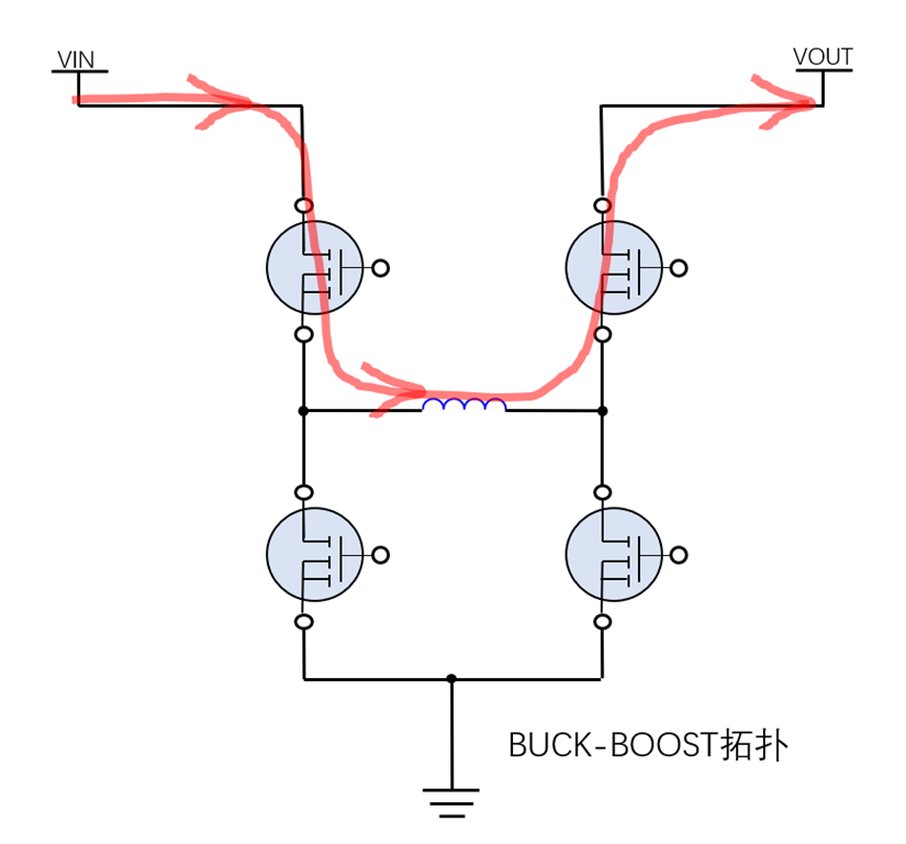 BUCK-BOOST拓扑下的直通模式可以直接让两个上管导通 ,形成经过两个上管和电感的通道,因此无需再另外增加开关管,当然这样也会有电感和两个上管的导通损耗。