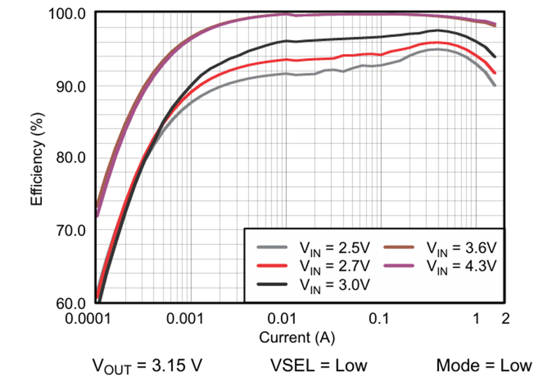 如下图是效率曲线,可以看出当VIN为3.6V与4.3V时进入直通模式,效率远高于其它输入电压下的效率,哪怕在100uA的负载下效率也能达到70%,在1mA负载下效率超过95%,对于电池设备这个效率已经很高了。