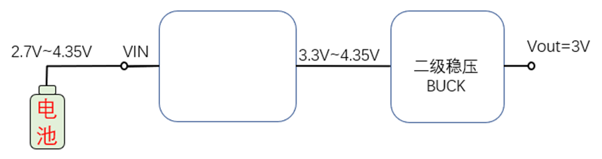 我们来看这个应用场景,这个芯片是用于锂电池的升压,所以输入范围为2.3~4.8V,输出电压可调,我们假设一个一个需要稳定3V的负载场景,如下图,这颗芯片作为第一级稳压来充分利用电池的整个电压范围,当电池电压为2.7~3.3V范围内,芯片工作在升压BOOST模式,输出电压为3.3V,而当电池电压为3.3V~4.35V范围内时TPS61281D进入直通模式,输出电压等于输出电压,因此在电池的整个电量周期内,TPS61281D输出电压范围为3.3V~4.35V,再经过二级稳压的BUCK来将输出电压稳定在3V。