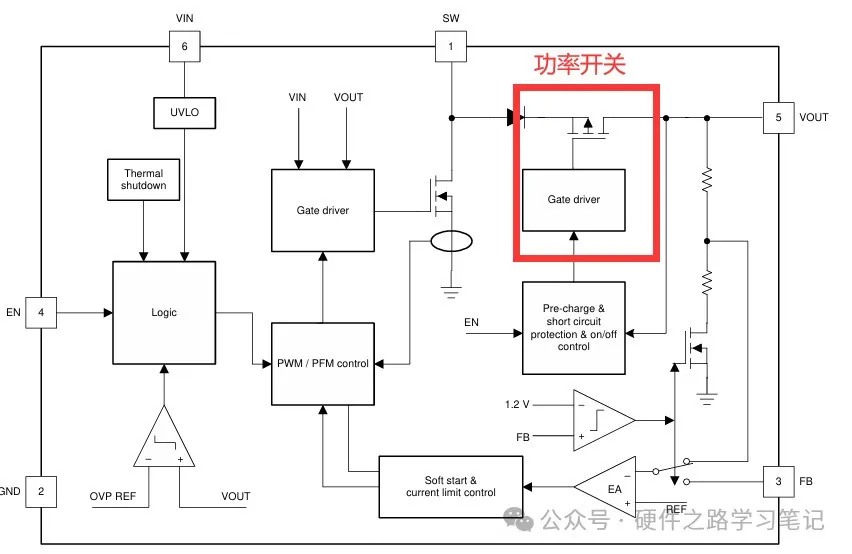 有些芯片是非同步的,但是其二极管是内置的,而且在二极管后又内置了一个功率开关,因此其可以完全关断如下图是其拓扑结构。