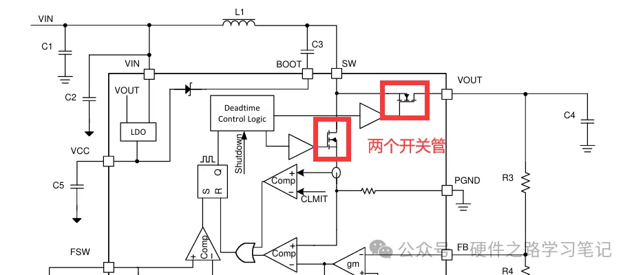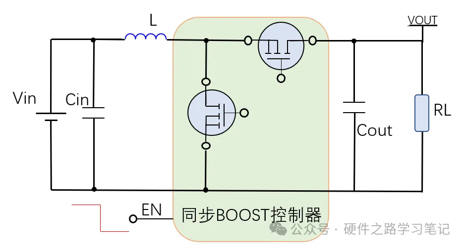 一般的集成同步型BOOST控制器结构如下图,内置两个开关管,用MOS管代替了二极管,效率更高,外围电路简单。
