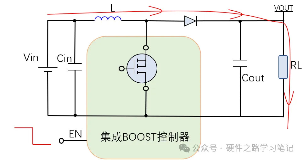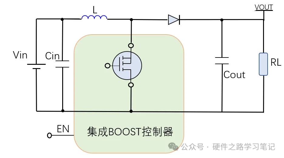 下图是BOOST电路的电路拓扑,集成非同步BOOST控制器器其实只是集成了BOOST拓扑电路的开关管,并且加入了一些其他的功能。