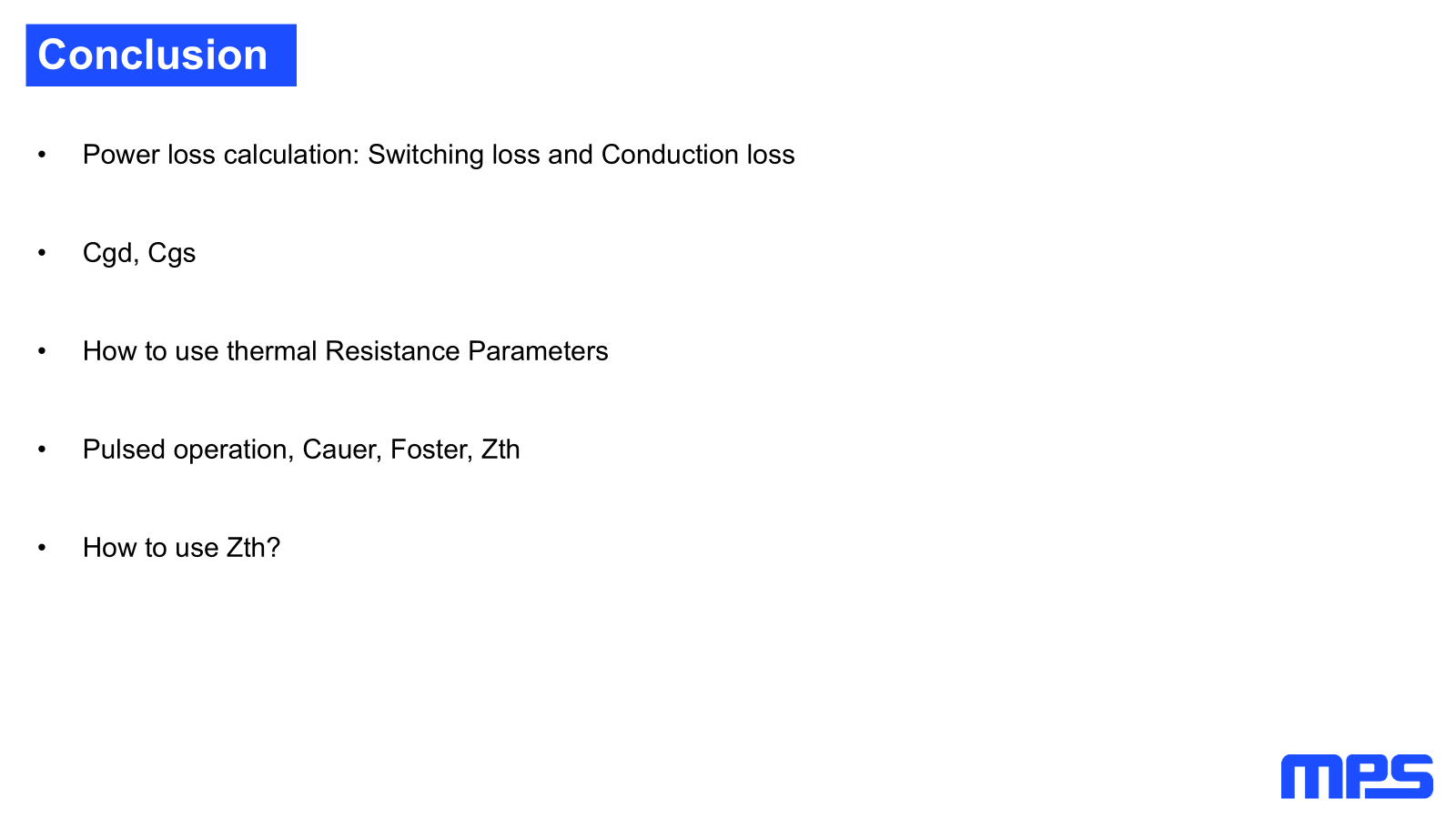 总结一下今天的内容。 首先介绍了功耗的计算,重点就是开关损耗的推导,其中主要是Cgd 米勒电容,Cgs 这两个电容决定我们rising time,从而影响switching loss;