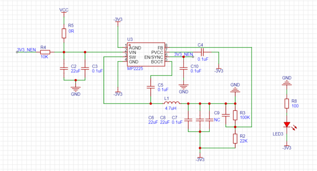 最近尝试使用用buck改buck-boost拓扑输出负压,于是我也做了一块小板,并也验证成功了,可以正常输出3.3V和-3.3V 。只需要VCC和GND两根线供电 就可以了