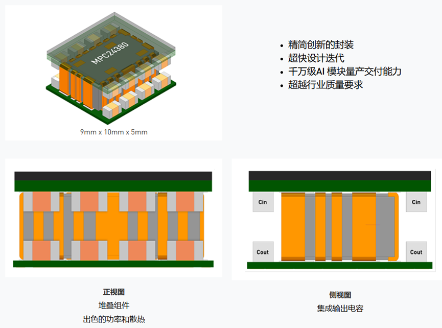 MPC24380-260采用Z轴供电™(ZPD™)架构,能显著降低PDN损耗,增强效率,打破了传统横向供电对PDN功耗和瞬态性能的限制。同时,MPC24380通过在模块内集成输出电容,可以支持更多稳压器模块(VRM),优化布局。另外,MPC24380采用了散热效率更高的DrMOS顶置设计,将功率器件堆叠在模块顶部,配合微通道液冷板,以极低ThetaJT实现了更佳热传递。