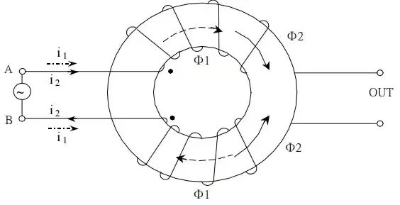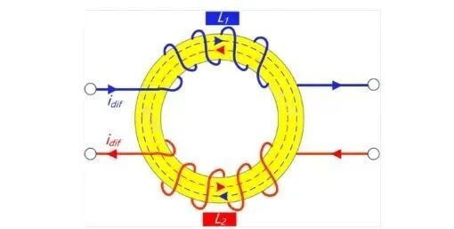 当差模电流流经共模电感时,因为差模信号是大小相同,方向相反的,所以产生的磁场方向就是相反的,会相互抵消,使得磁芯的电感量几乎是没有的,所以对于差模干扰的阻碍作用就几乎没有,差模信号可以非常顺利的通过共模电感。