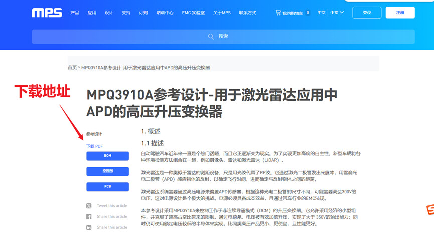所以我很想得到一种不需要变压器的高压升压方案。这样我也可以玩辉光管了(~ ̄▽ ̄)~你说巧不巧,恰巧我再逛MPS官方论坛的时候,看到了一个高压升压方案(不需要绕变压器),这个方案原本是为激光雷达的APD驱动电路,其是采用MPQ3910A来控制工作于非连续导通模式(DCM)的升压变换器。它允许采用经济的小型组件,并克服了超高占空比带来的限制。比同类高压产品更小、更便宜,且性能更好。