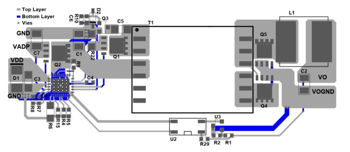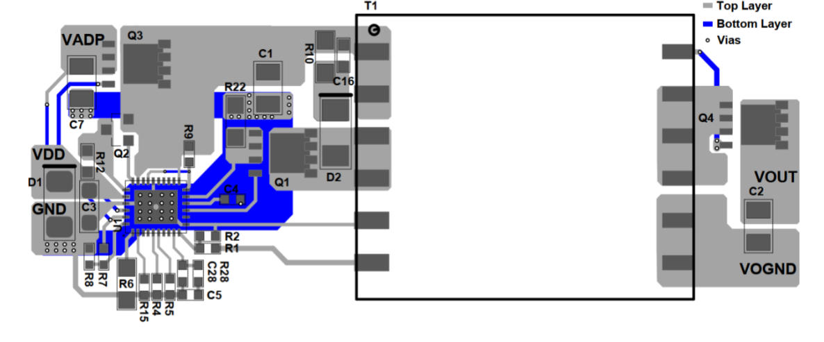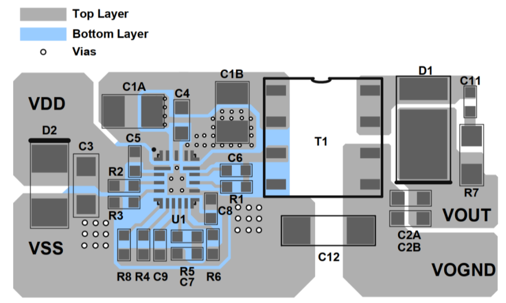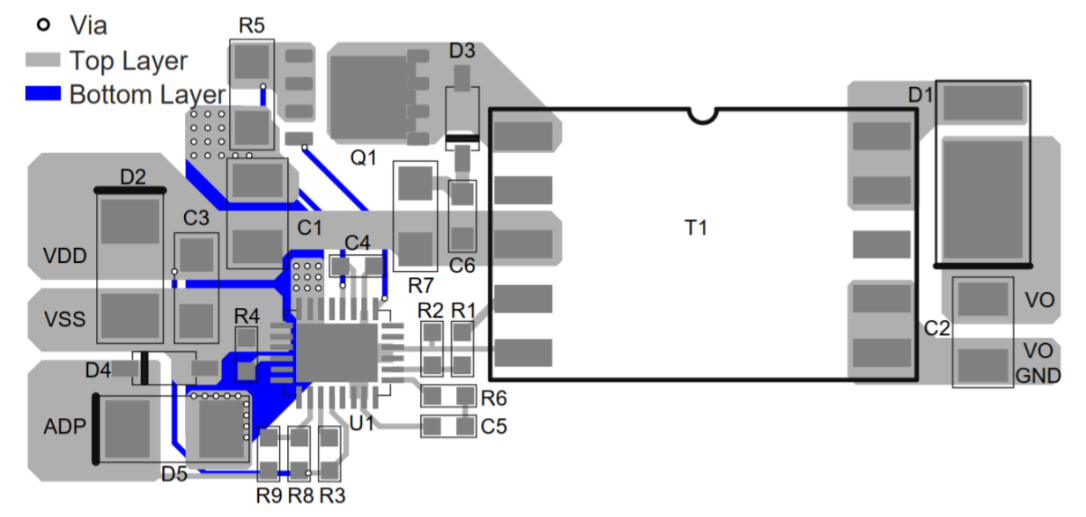 输出功率环路需要尽可能小,走线短而粗。输出功率环路为变压器副边(T1)→整流二极管(D1)→输出电容(C2A,C2B)→回到变压器副边(T1)。 功率走线需要尽可能粗,否则可能造成芯片带载能力不足。