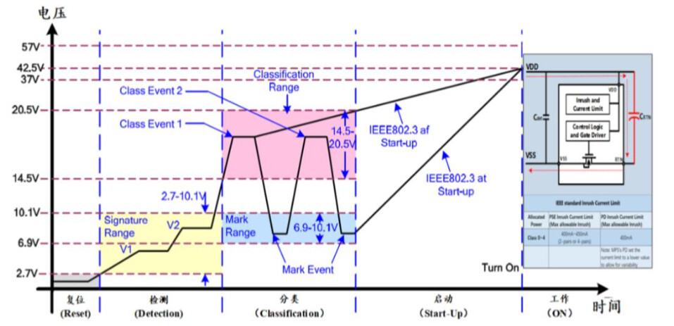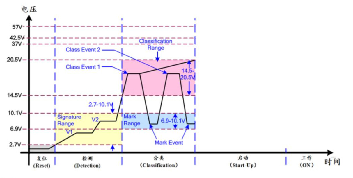 完成这三个阶段,PSE即可给PD提供所需电压及功率。