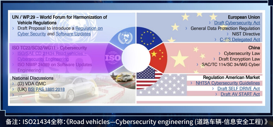 Cybersecurity 是2021年国际标准委员会颁布的汽车信息安全领域首个国际标准 ISO21434, 它在世界范围内都有各种应用。
