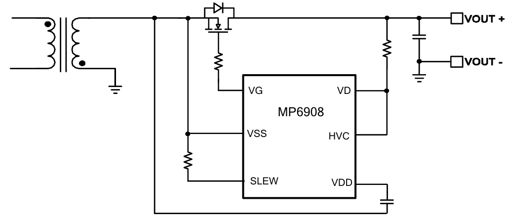 MP6908通过SLEW端口设置开通定时器的时间,如果VDS电压在TSLEW内从2V降到-86mV的开通阈值,则经过一段延迟时间T DON,同步整流MOSFET开通。以防止由于振铃造成MOSFET意外关闭,在MOSFET开启之后有一段约1.1us的消隐时间, V DS的值变为-I DS×R DS(ON)(I DS为副边电流,R DS(ON)为同步整流管的导通电阻),由于副边电感一直释放能量,副边电流不断减小,VDS的值不断增大。