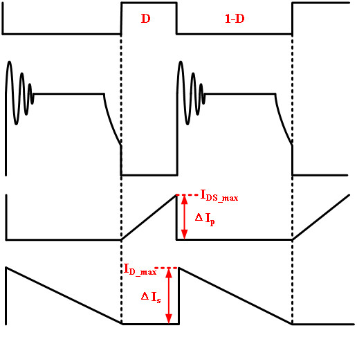 CRM下的工作波形如下图所示,从上到下分别是驱动电压波形、MOS管漏源电压波形、原边电流波形和副边电流波形。