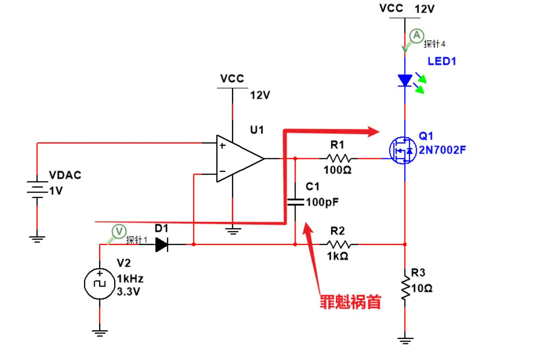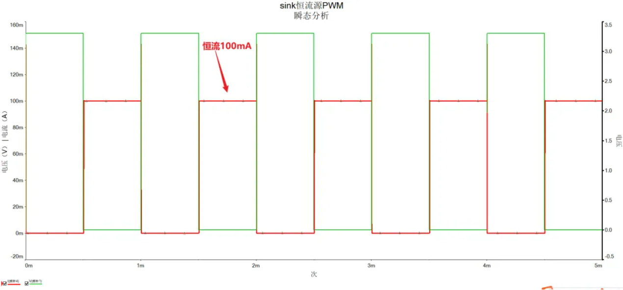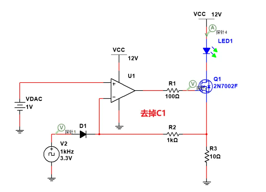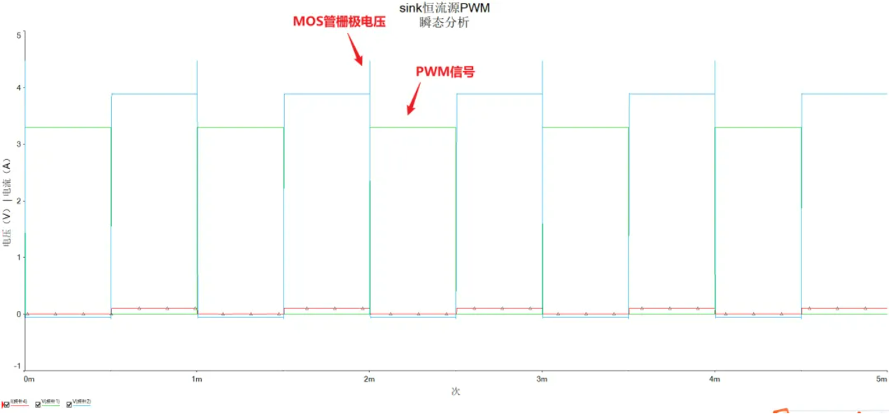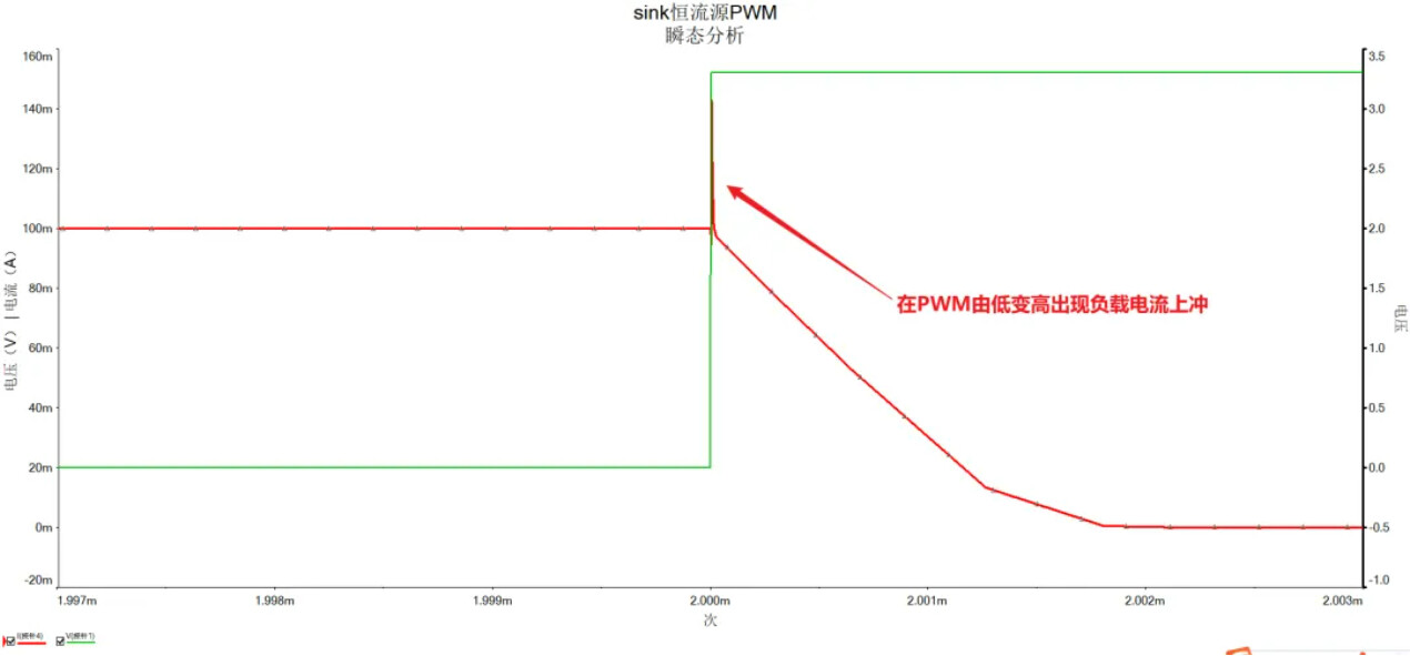 那么这个问题是什么导致的呢?其实是电容C1导致的。在PWM由低变高的过程中,由于反相输入端的电压会突然上升,而电容两端电压又不能突变,所以会导致运放输出端电压上升,最终导致输出给栅极的电压变高,从而恒流电流值会突然上升一小段。