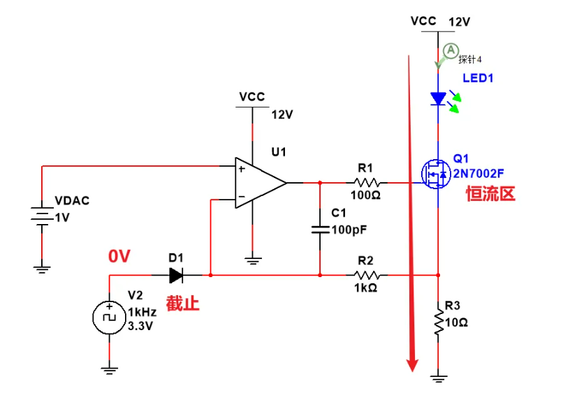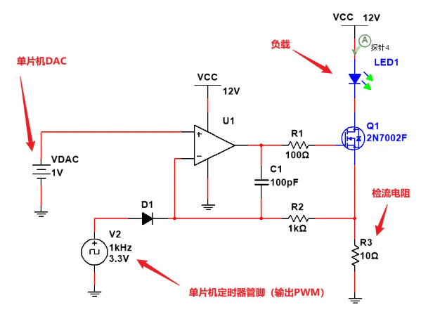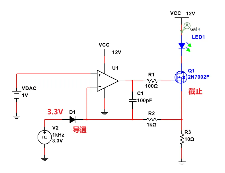 如果PWM处于高电平,那么此时D1会处于导通状态,然后运算放大器的反向输入端电压大概就为3V左右,大于VDAC,那么此时运放会输出0V左右(靠近运放的负电源轨,具体要看运放型号)。那么此时MOS管会处于截止状态,也就没有电流流过负载。如下所示: