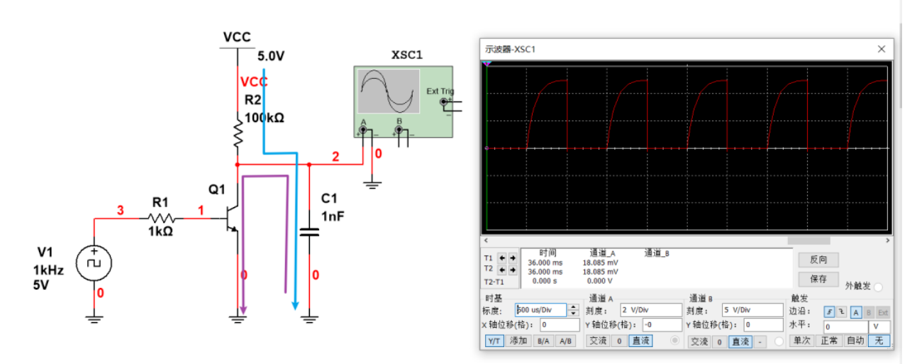 可以看到上升沿变得很缓慢,因为在三极管截止时,上升沿的爬升,是通过蓝色路径,通过R2上拉电阻去给电容充电的,所以上升沿变得极其缓慢。但是三极管导通时,是通过三极管直接进行放电的,所以下降沿不是很缓慢的。