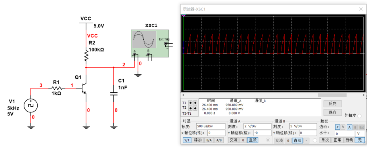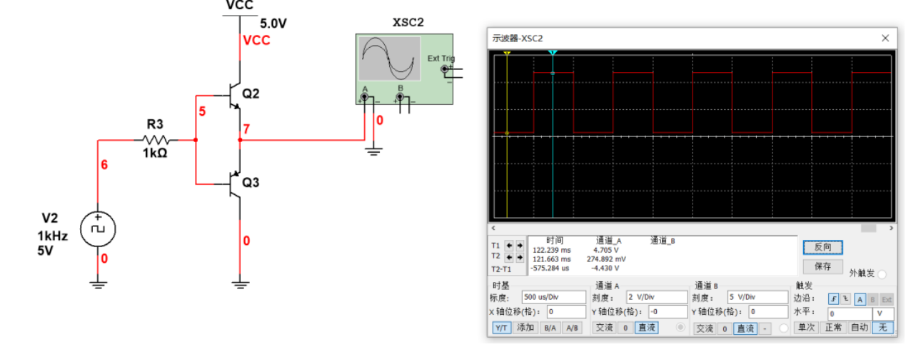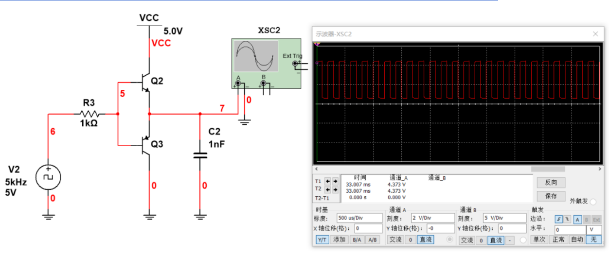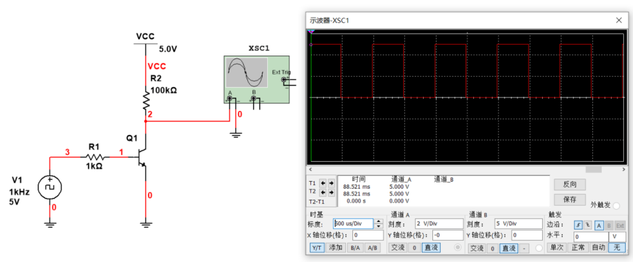 然后我们仿真一下,在这种情况,输入1khz方波控制三极管,然后输出也是1khz方波,且波形还是挺规整的,上升沿和下降沿都很陡峭: