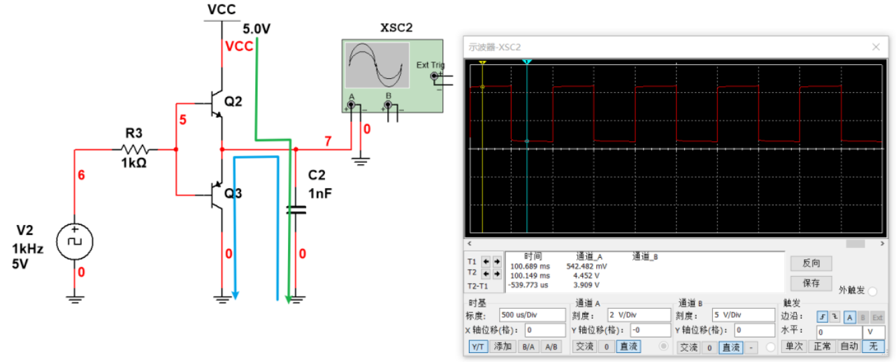 那么和之前一样,如果在输出端加一个1nf的电容(模拟线缆寄生参数)会怎样呢?当V(6)为高电平时,上管Q2导通,下管Q1截止,通过绿色路径给电容快速充电;当V(6)为低电平时,下管Q1导通,上管Q2截止,通过蓝色路径给电容快速放电。可以看到这个结构并不像之前上升沿会变缓,而是几乎没什么影响。