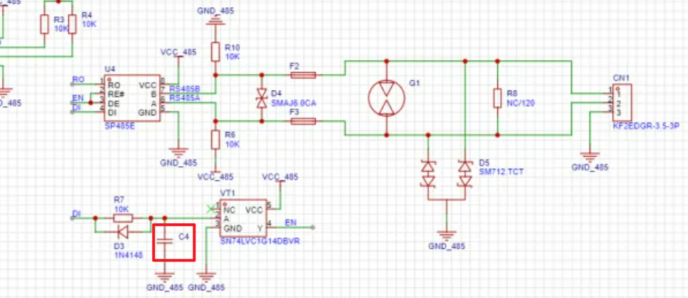 这种结构的输出在驱动长线缆时,就不会出现这种上升沿缓慢的问题。这个也就是之前分析的RS485自动收发电路中,那个电容的作用,就是在每1bit位发送阶段,保留一小段的推挽输出时间,让芯片可以输出高电平,而不是靠上下拉电阻。