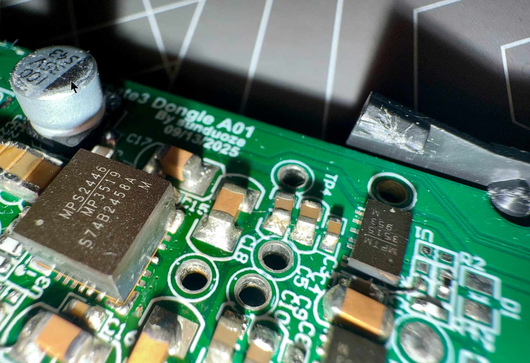 焊接过程可以说是一场“微操”挑战。尤其是MPM3515和MPM3519这两个电源模块,引脚间距小,且对焊接温度和热风枪风速要求比较高。焊接第一块板子,由于技术不够精湛,有个qfn的pin脚掉落,最终努力吴国,报废啦。最后我采用的是“锡膏+热风枪”的方式,配合显微镜(手机的微距)进行对位和检查,确保没有短路或虚焊。