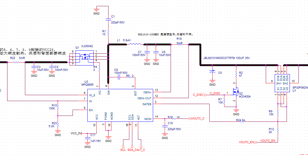 您那里可以先理论计算开关损耗和导通损耗。先从理论上判断一下最大损耗发生的位置,或者用仿真跑一下,定位损耗,或测试开关管的电压电流波形也可以算出损耗大小。其次您讲到MP8856发热严重,一方面损耗大会导致发热严重,但是热管理的设计不当也会导致温升严重,温升高无法直接确定是8856的损耗。由于这个是同步buck的拓扑,通常来说下管损耗主要是导通损耗,而非开关损耗,您提到20V3A的情况下效率是94.5%,下管导通损耗是I^R*(1-D),您可以算一下5V3A和20V3A的下管损耗差异,我刚刚算了一下,大概相差0.1W,乘以芯片热阻,大概温升5℃左右。具体的计算您需要再确认一下。
