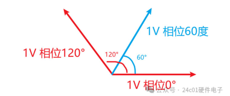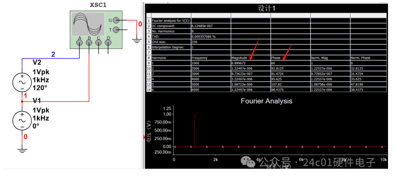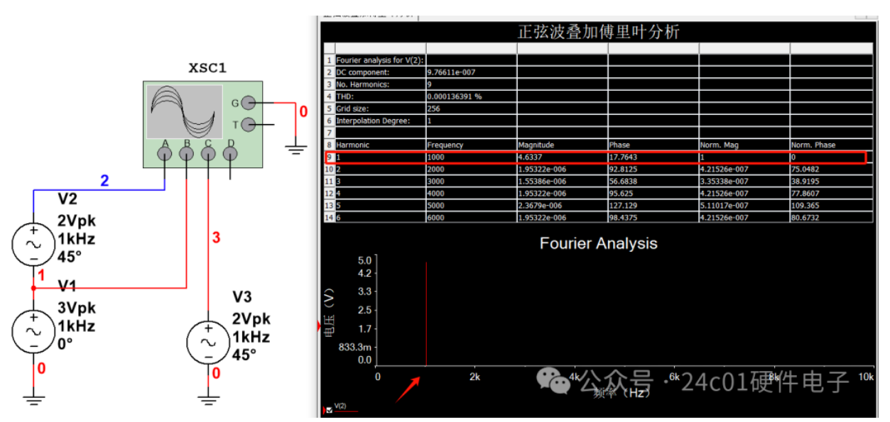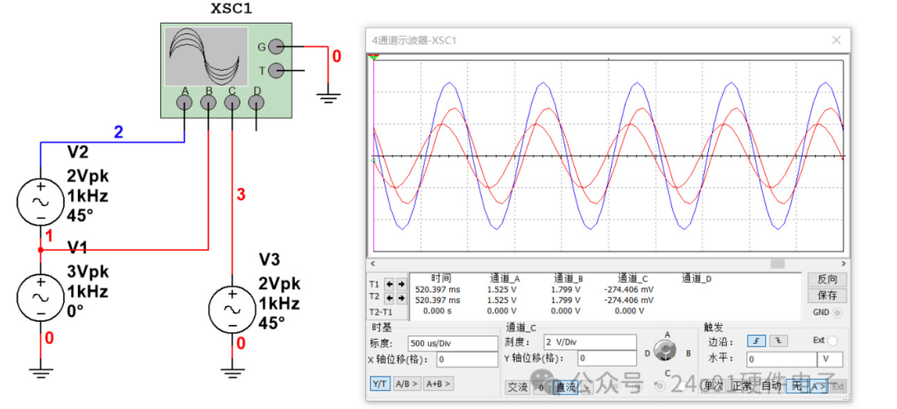 例如如下仿真,两个正弦波,下图的V1和V2,频率相同(均为1khz),相位不相同(相差45°)和幅值不相同(2V和3V),叠加到一起,最终得到的还是正弦波。(V3作为V2的参考)最终合成的波形是蓝色的正弦波,频率仍然是1khz,幅值为4.6V,相位为17°左右。