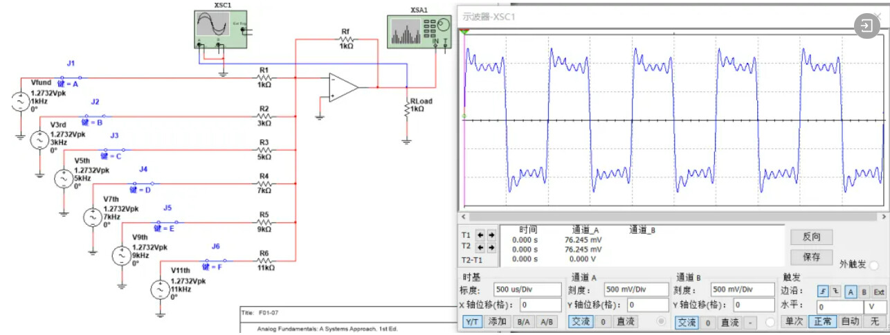 通过学习傅里叶变换我们知道,任何波形都可以由无数正弦波叠加而成,例如下图,我们用正弦波叠加出一个方波的“雏形”。