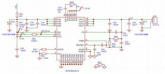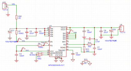 输出: 稳定的直流电压从 VOUT引脚输出。尽管芯片内部已集成电感,外部可能仍需要输出电容(如 C17, TP13, TP14)来进一步滤除纹波并提供更快的动态响应。