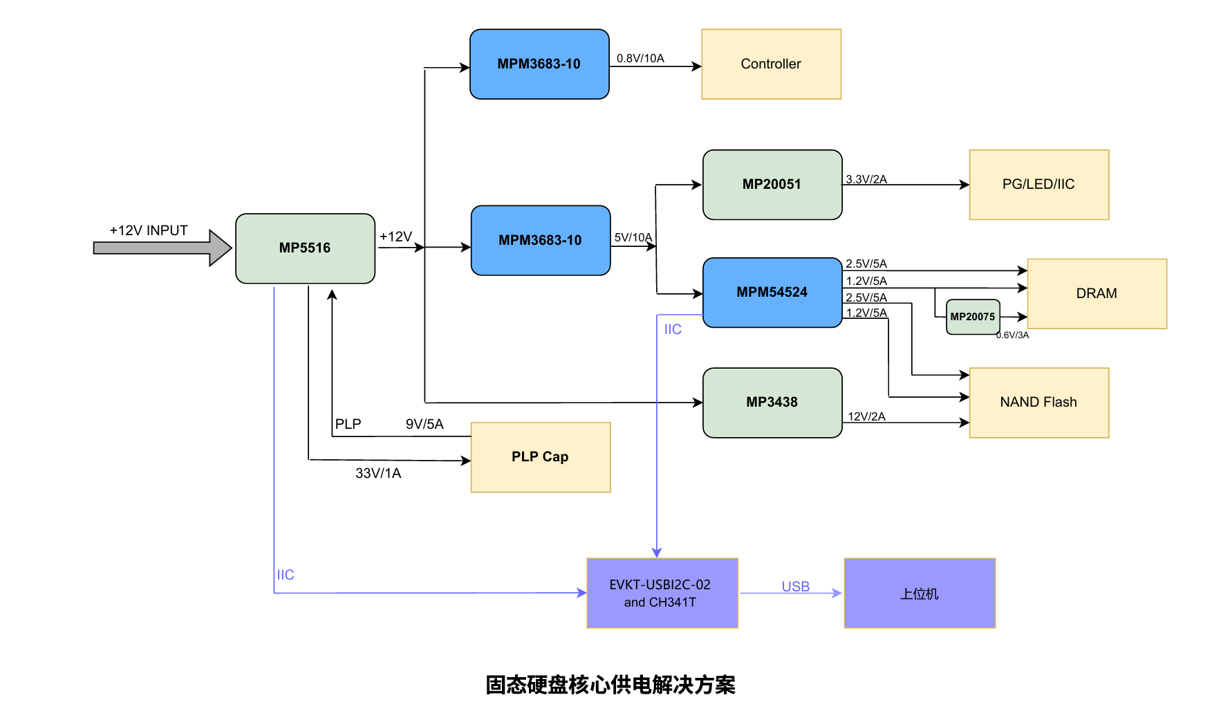 SSD 内部需将外部高压(12V/5V)转换为各组件所需的低压直流电,核心依赖电源管理 IC(PMIC) 或分立 DC-DC 转换器,架构如下: