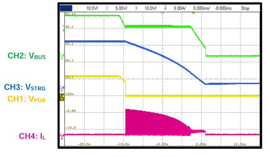 当外部VIN不正常,触发MP5516欠压保护后,MP5516切断外部输入,储能电容通过buck电路进行放电,VSTRG降压给VBUS,为后级电源进行供电。