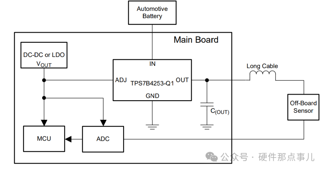 比如我们把给外部供电的Tracker LDO的ADJ引脚接到给MCU供电的LDO输出上,比如如果Tracker LDO具有±4mV的跟踪精度,这样就能实现给外部传感器供电的电源和ADC的参考电源基本是一致的,这样就能满足LDO短路保护的需求,又能实现电源偏差导致的ADC采样误差最小化。