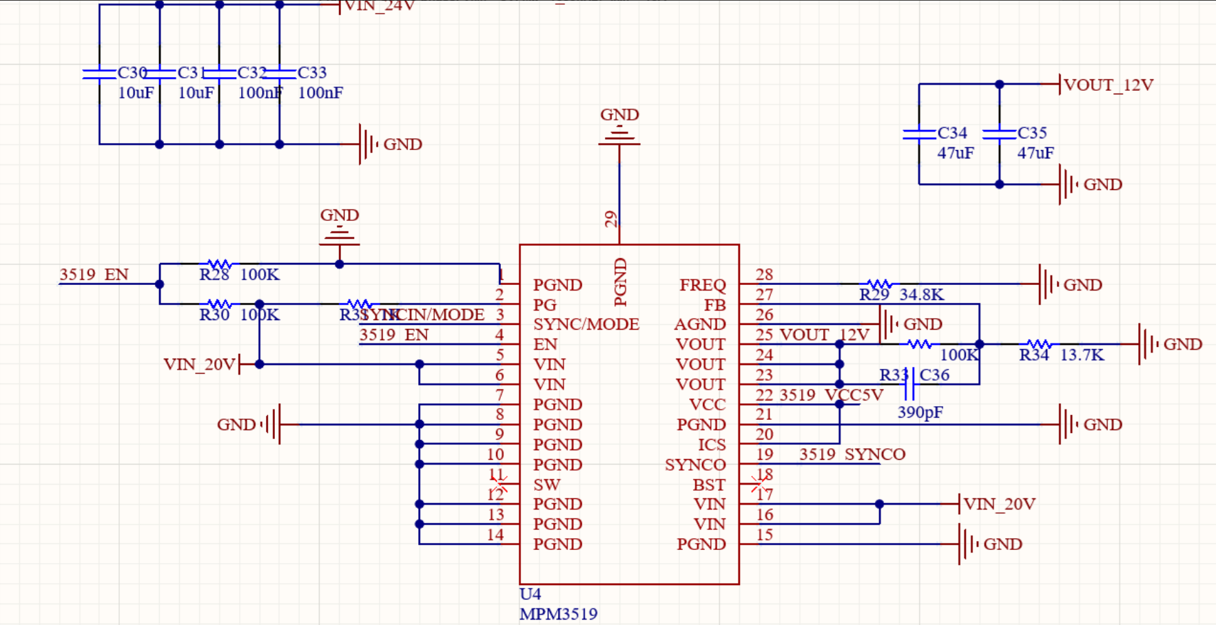 MPM3519芯片手册典型应用电路如上图所示,参考此电路进行修改得到如下24V转12V电源电路。