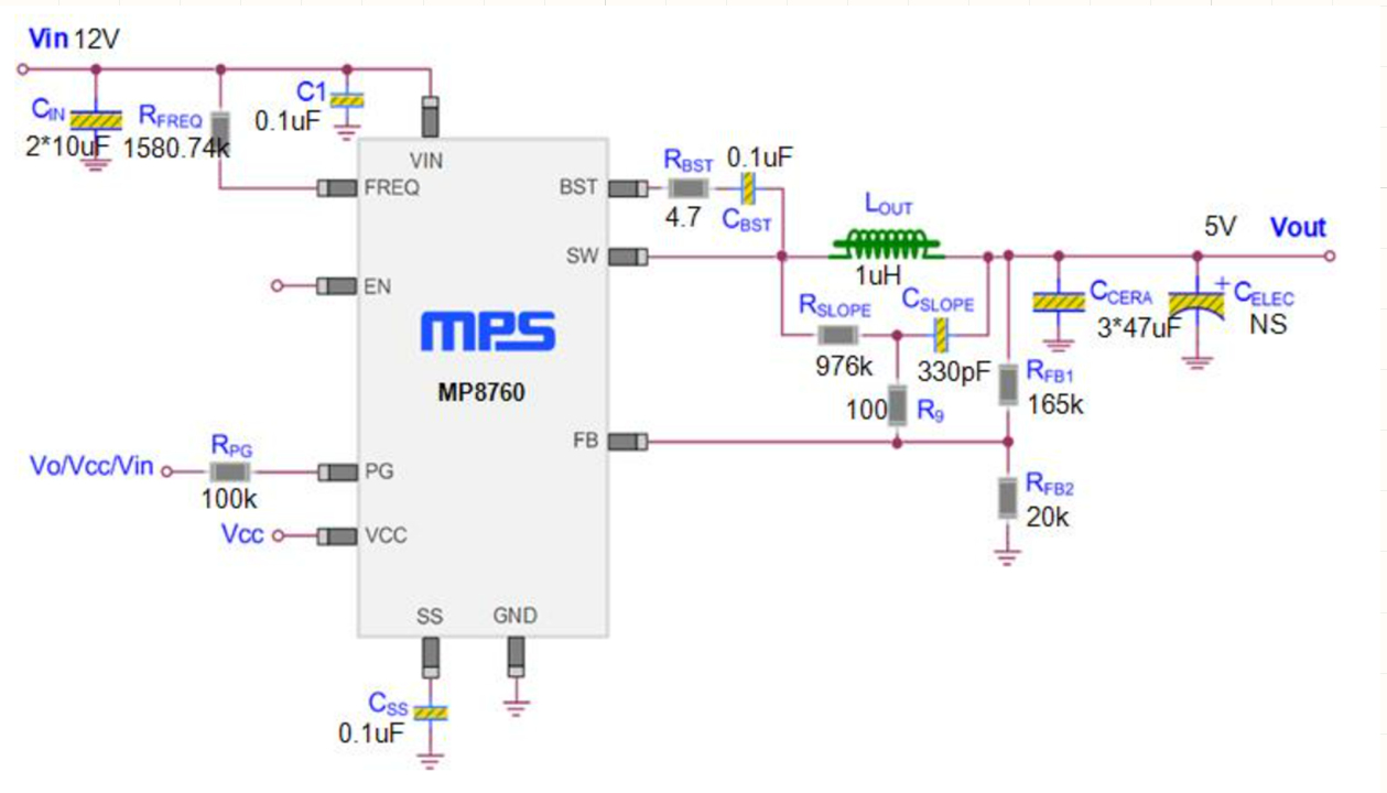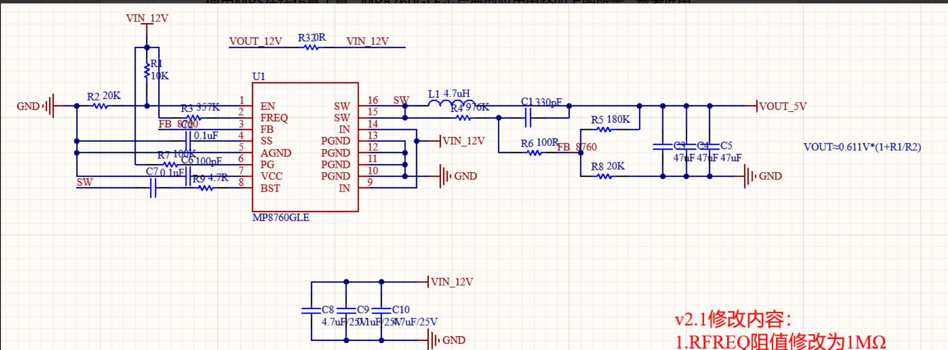 使用MPS在线仿真工具,MP8760GLE芯片典型应用电路如上图所示,参考此电路进行修改得到如下12V转5V电源电路。