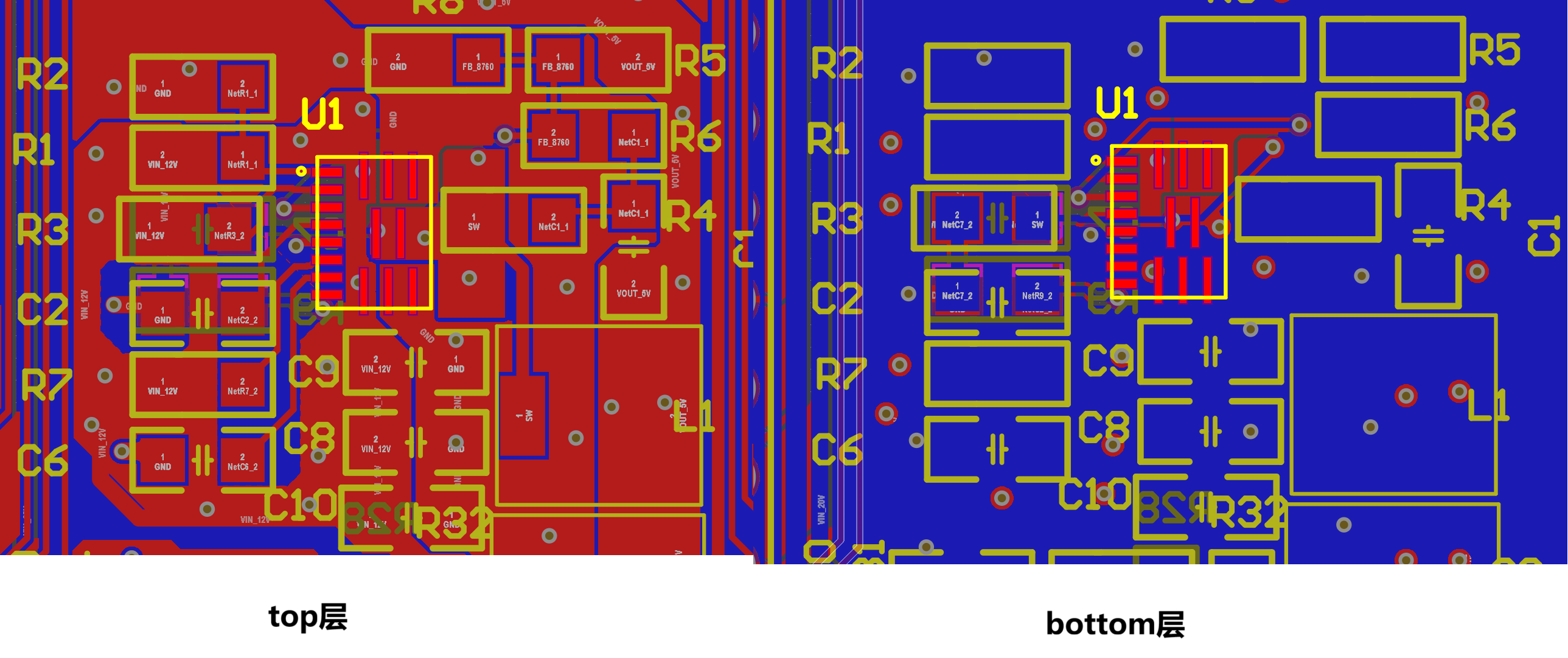 PCB采样2层板,参考芯片手册中PCB设计要点,本次项目中MP8760GLE 同步降压(Buck)PCB设计经验总结如下: