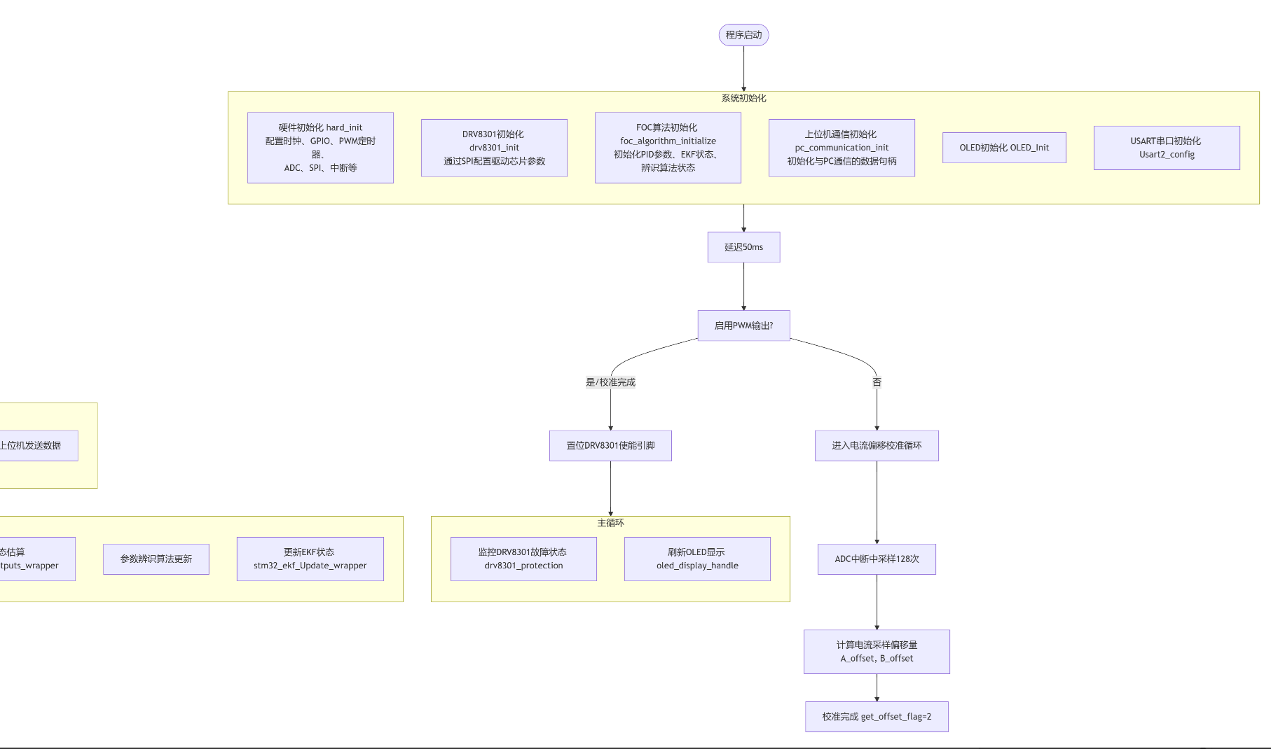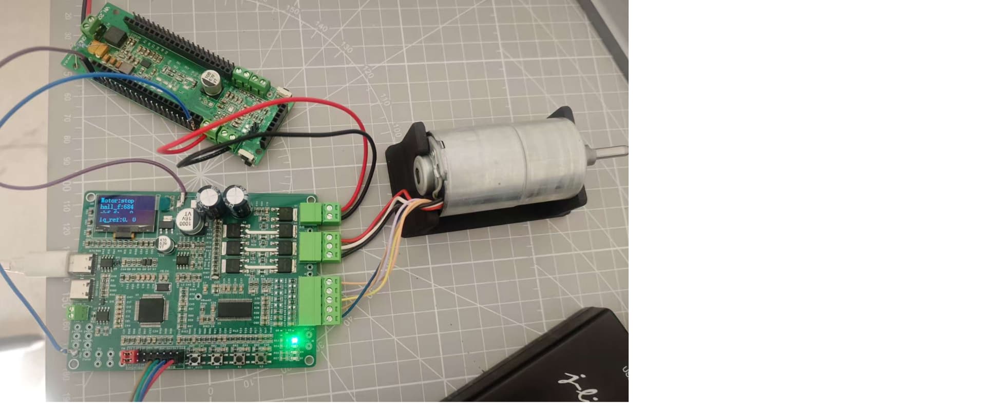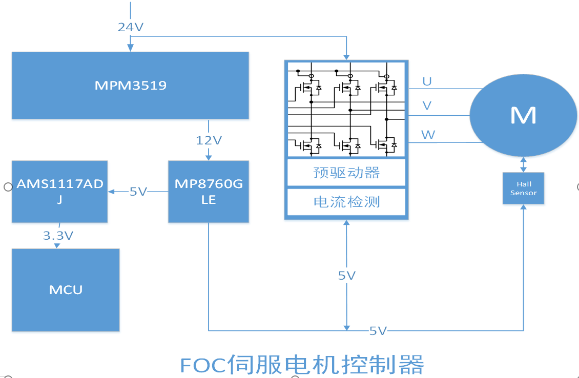 整体接线如上图所示,包括电源板、驱动板、电机三部分组成。电源板为驱动板和电机供电,驱动板用于FOC电机驱动、相电压电流采集、霍尔传感器信号采集、PID算法、速度环、电流环,电机为24V/0.5A直流无刷电机、带霍尔传感器。